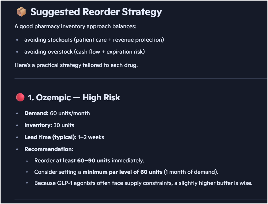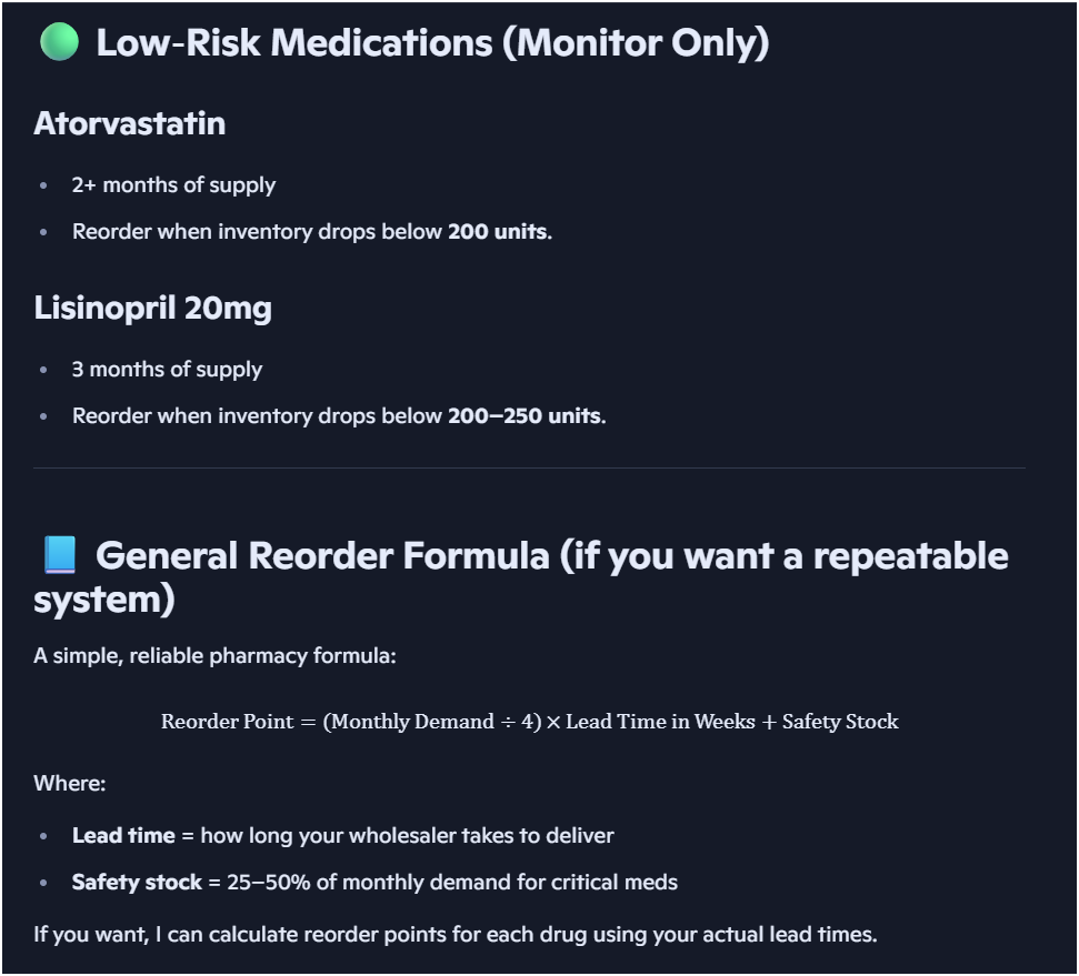 Which medications are at risk of stockout and what reorder strategy would you suggest?"