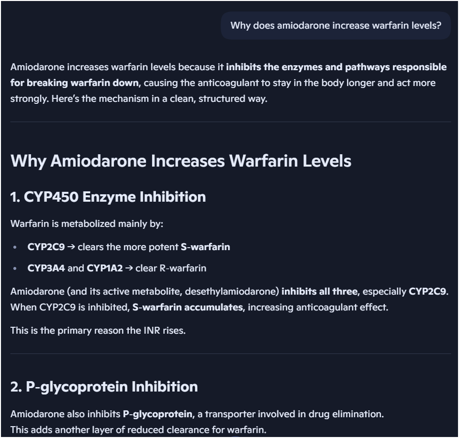 For example: "Why does amiodarone increase warfarin levels?"