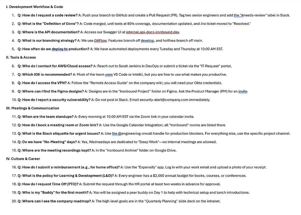 Days 1-2 (Collect): Gather your team's "Frequently Asked Questions (FAQ)" (e.g., "How do I request a code review?" or "Where is the documentation for the API?").
