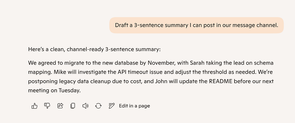 Task 3: Then say: "Draft a 3-sentence summary I can post in our message channel."