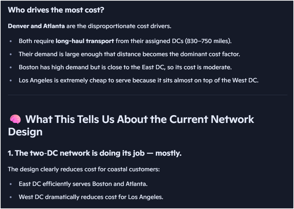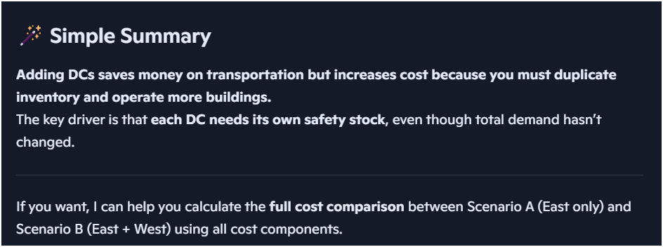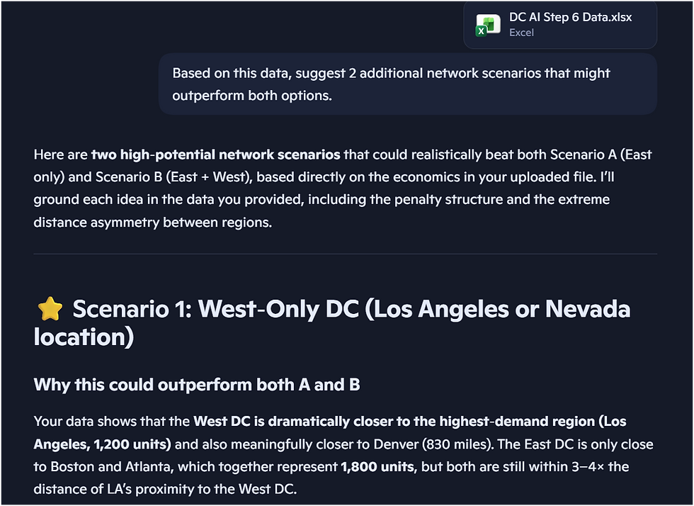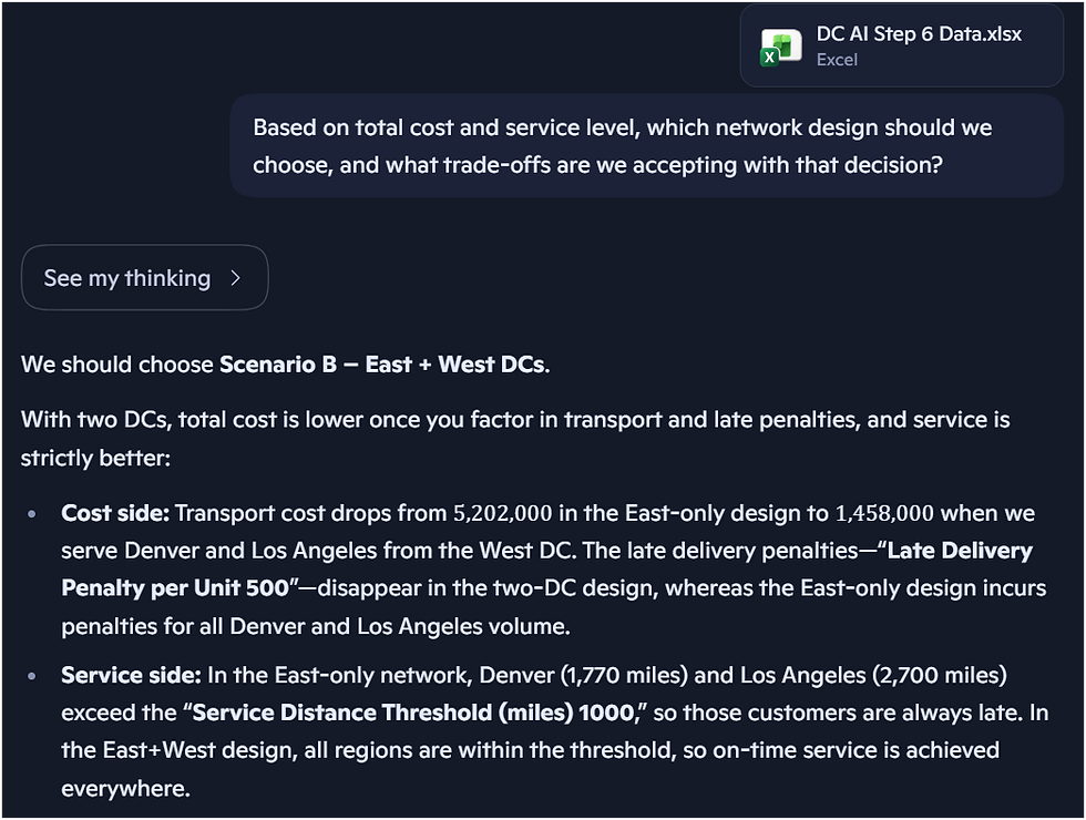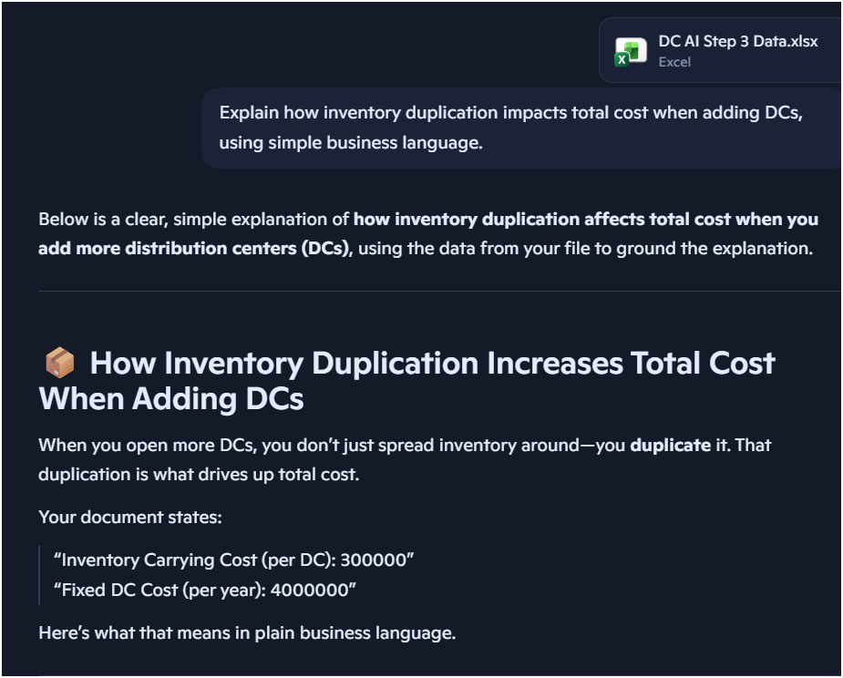 We start by running the numbers in Excel: transport, facility, inventory, and service costs. Then AI steps in to challenge assumptions, suggest smarter alternatives, and explain the trade-offs in plain language.