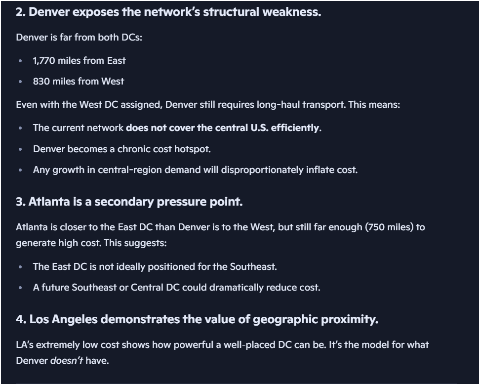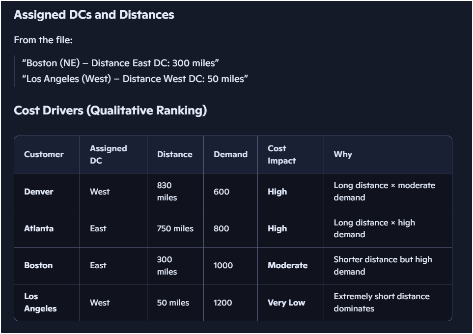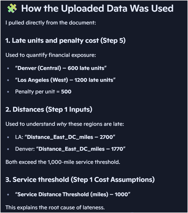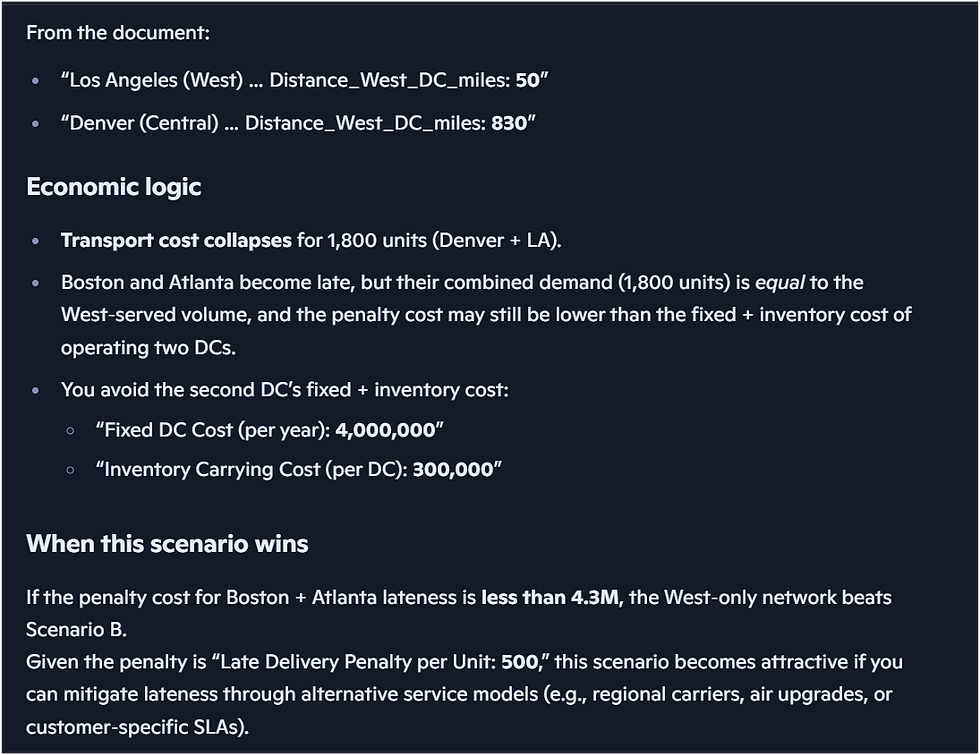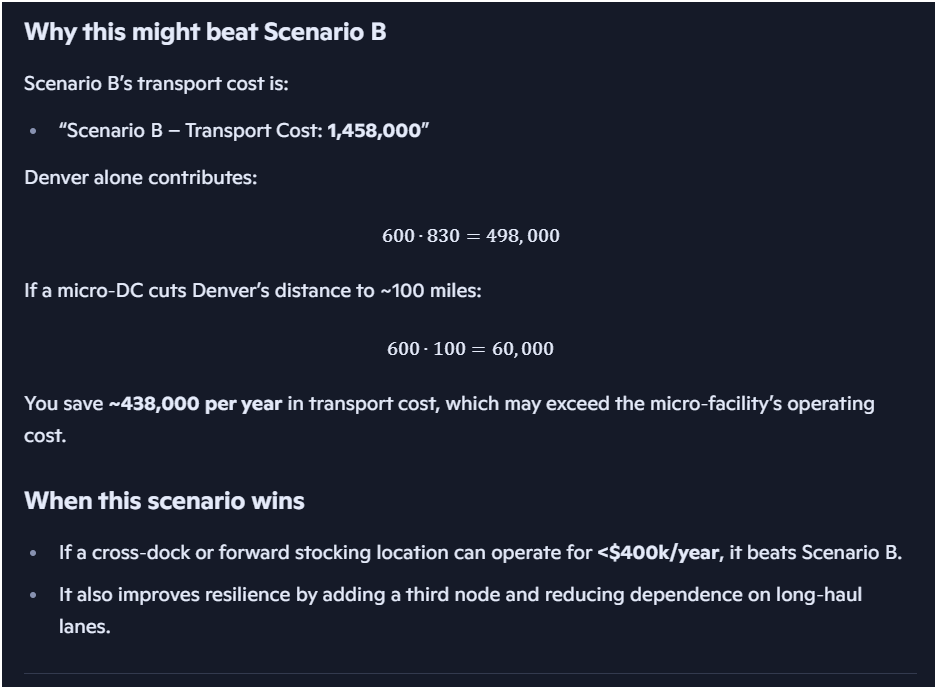 We start by running the numbers in Excel: transport, facility, inventory, and service costs. Then AI steps in to challenge assumptions, suggest smarter alternatives, and explain the trade-offs in plain language.