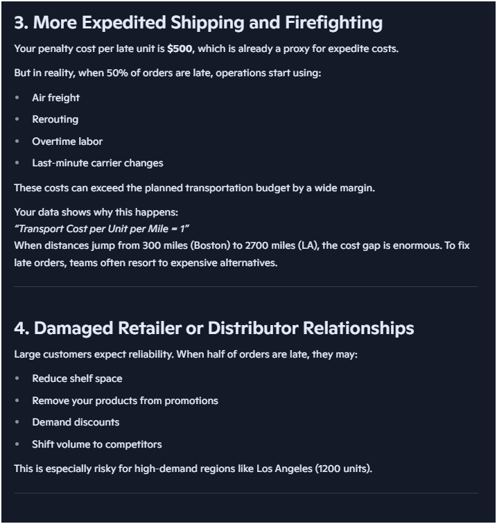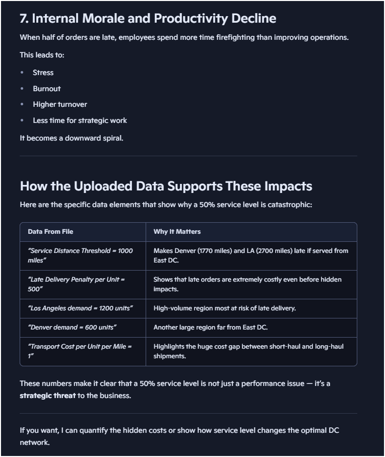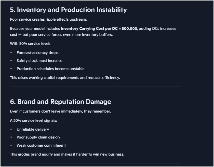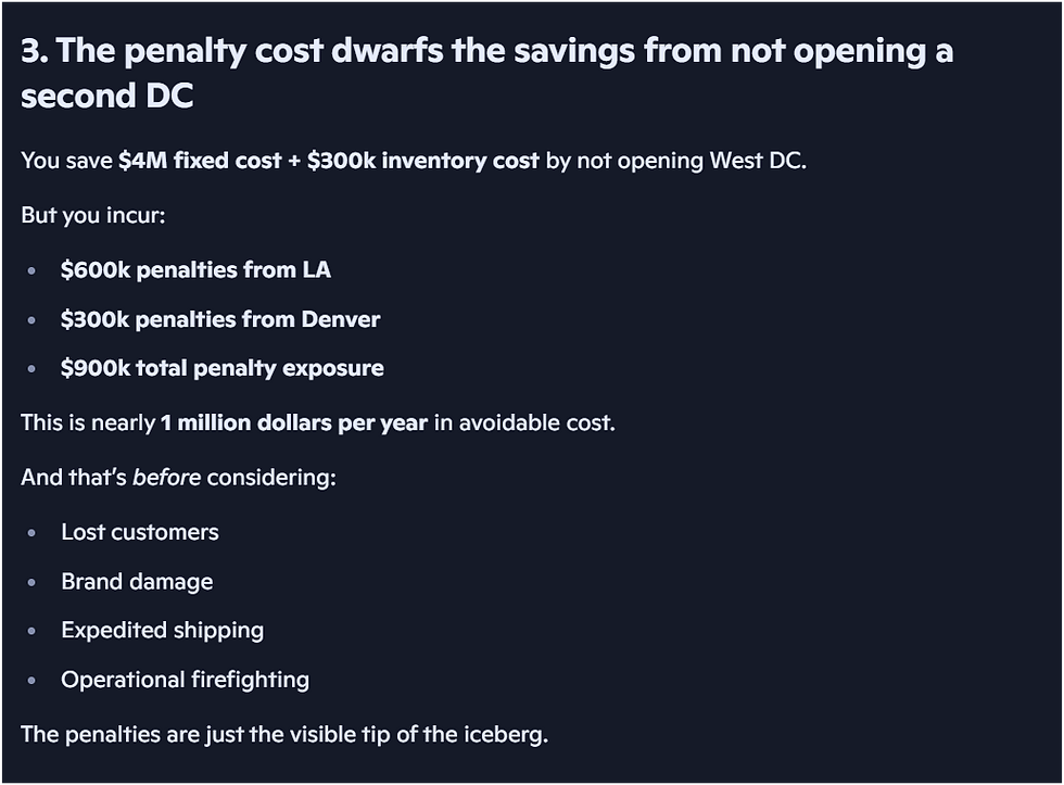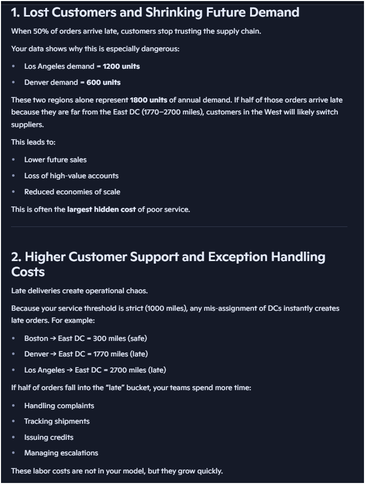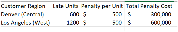 Step 5a: Penalty Cost Calculation Let’s understand how service failures translate into financial impact. This step exposes the true economic cost of poor performance and ensures network decisions reflect total business impact, not just transportation or facility expenses, aligning operational choices with customer satisfaction and long-term profitability.