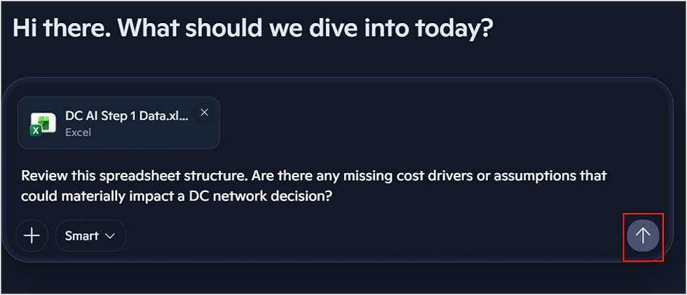 Note:Â This module demonstrates how AI can support DC network optimization in a simplified, 30-minute exercise. In real-world applications, significantly more effort is required, especially to collect accurate, complete data. AI can analyze quickly, but data integrity, validation, and scenario refinement are critical to producing trustworthy results and making confident execution decisions.