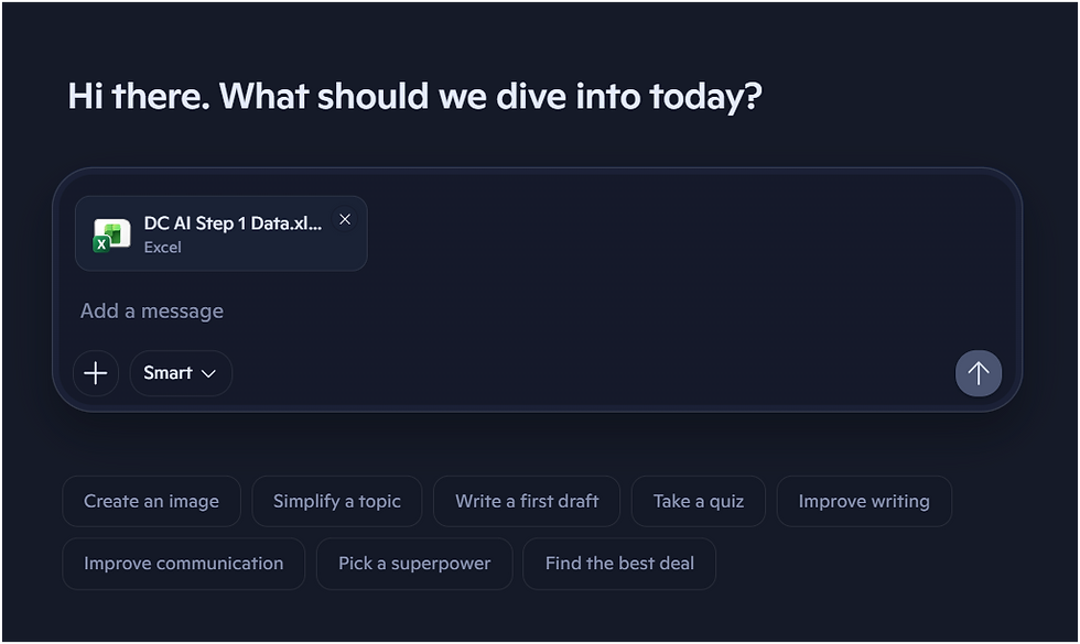 Find the "DC AI Step 1 Data" and upload. Once uploaded, the file while appear in Copilot