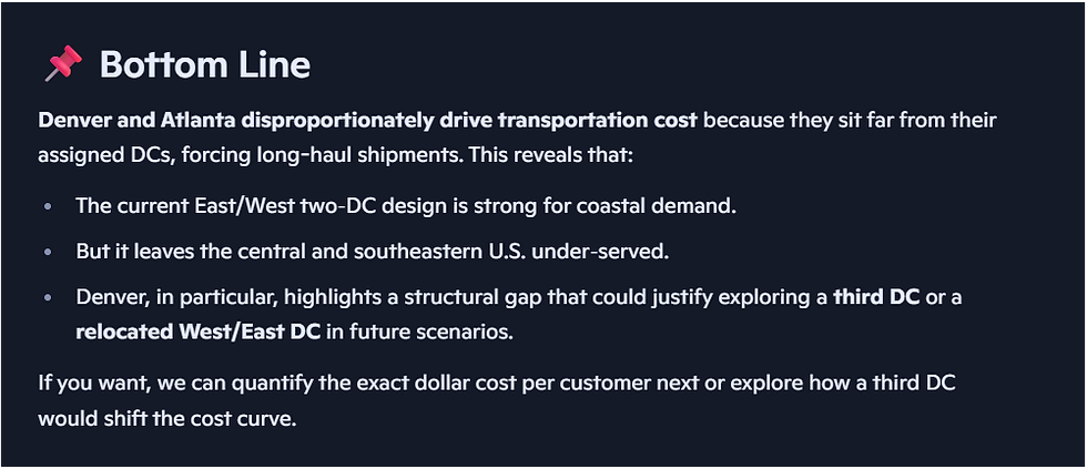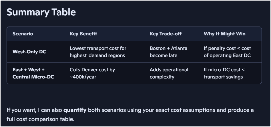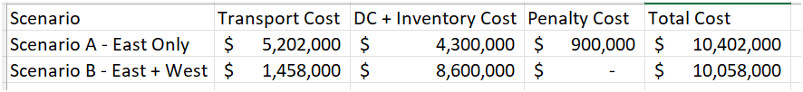 Let’s bring it all together into one clear comparison. By combining transportation, facility, inventory, and penalty costs, we reveal the true total cost of each network option. This holistic view enables stronger executive decisions, balancing efficiency, service performance, and long-term profitability.