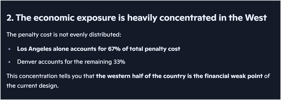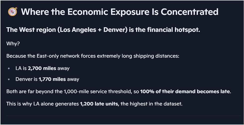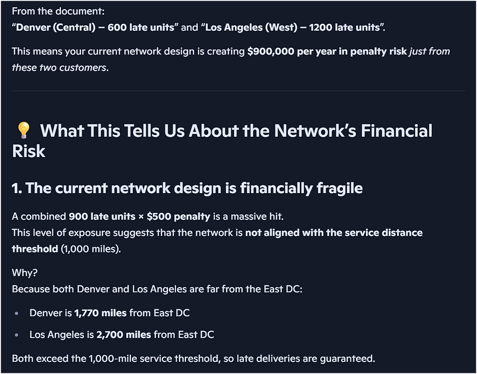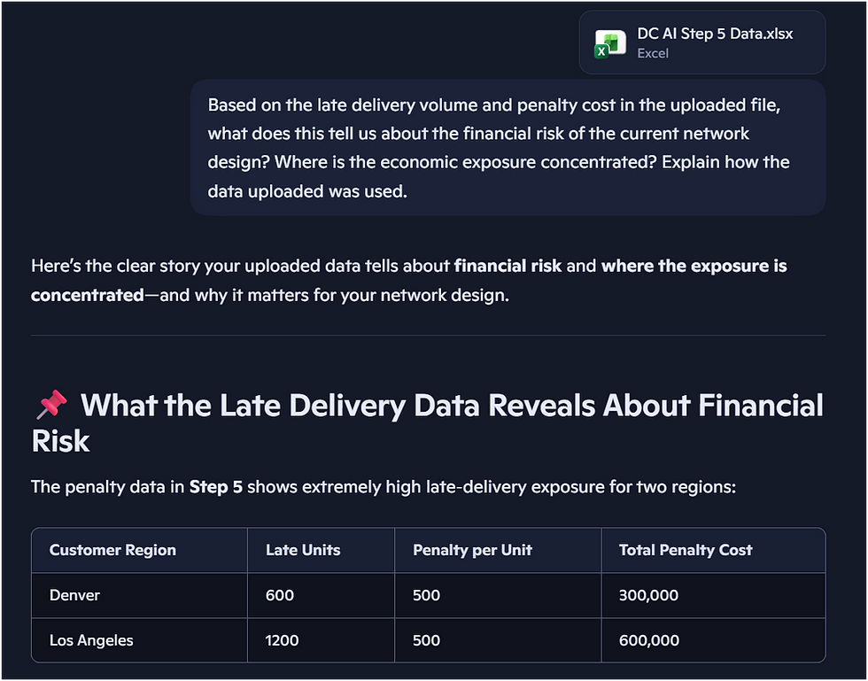 "Based on the late delivery volume and penalty cost in the uploaded file, what does this tell us about the financial risk of the current network design? Where is the economic exposure concentrated? Explain how the data uploaded was used."