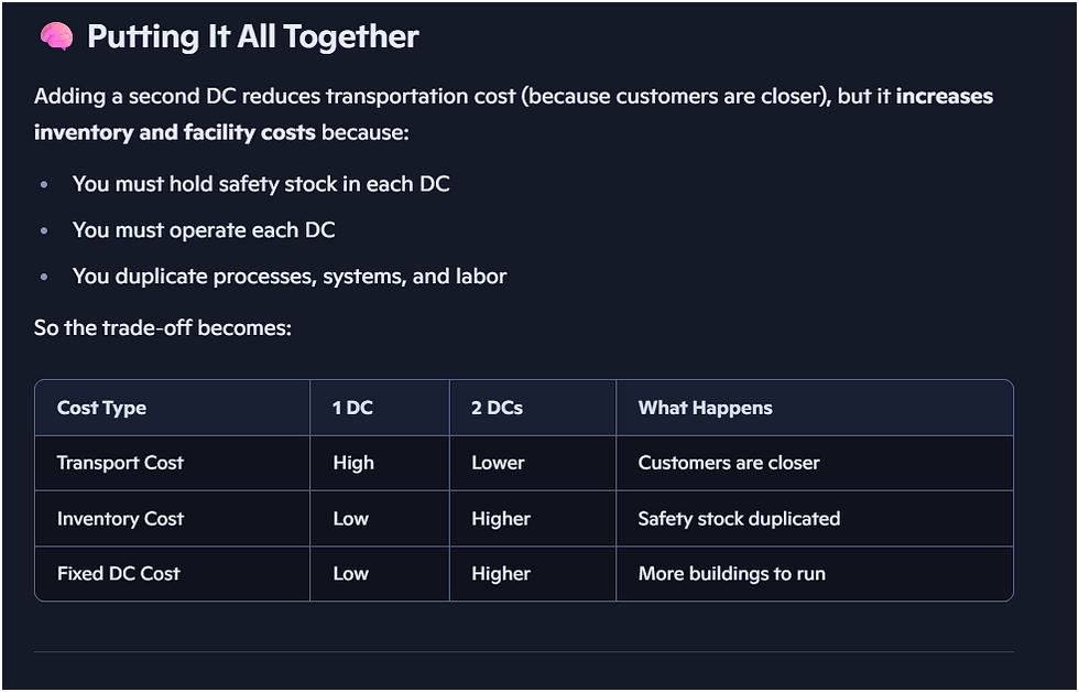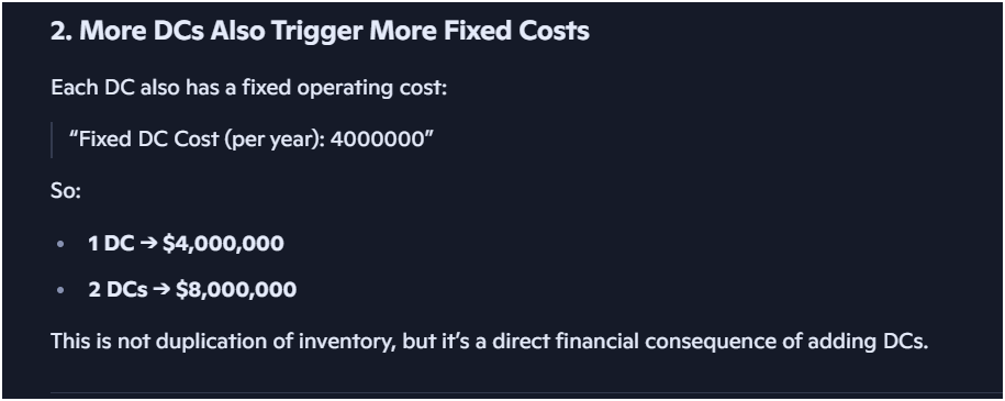 “Explain how inventory duplication impacts total cost when adding DCs, using simple business language.”