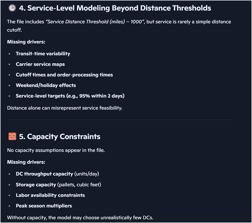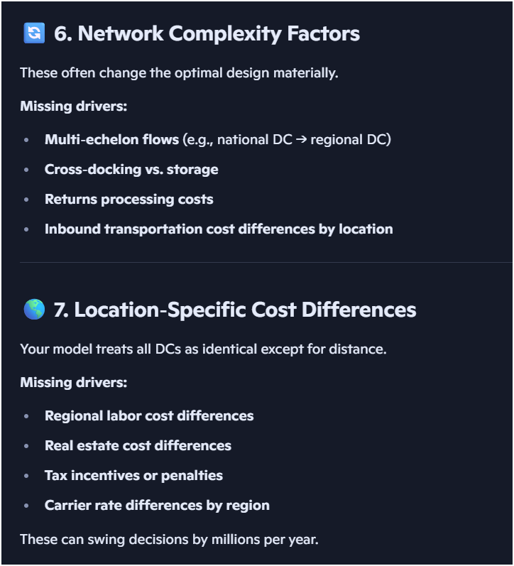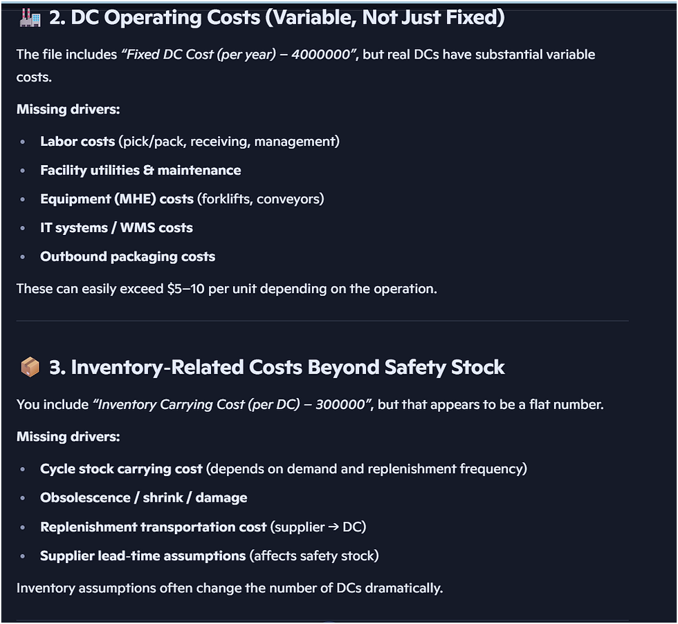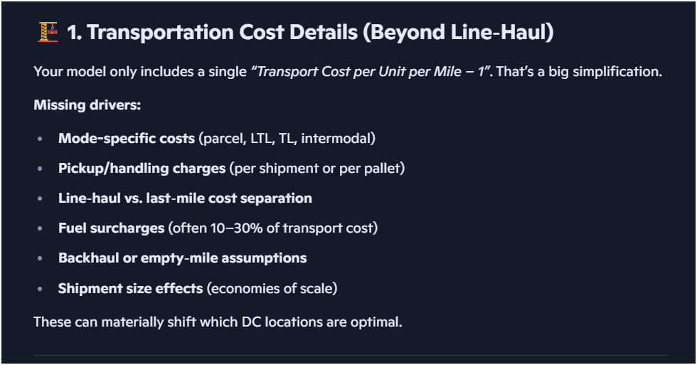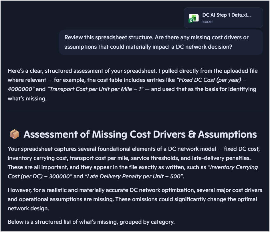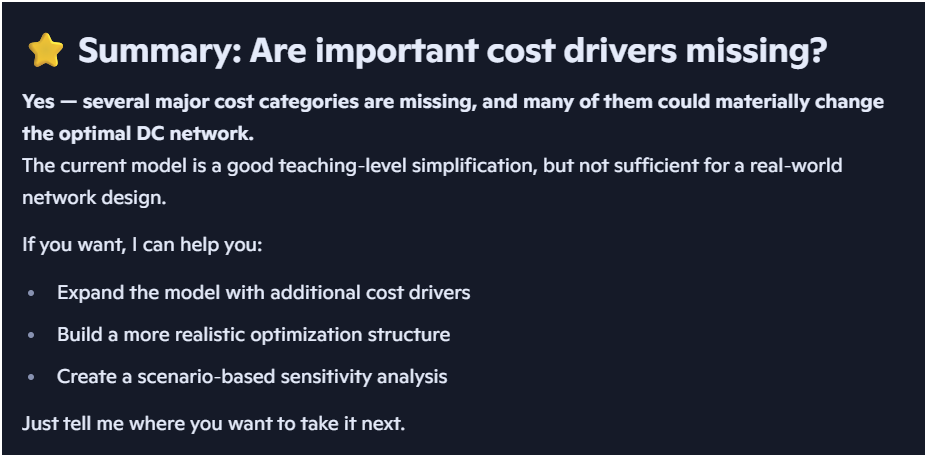 “Review this spreadsheet structure. Are there any missing cost drivers or assumptions that could materially impact a DC network decision?”