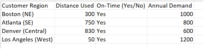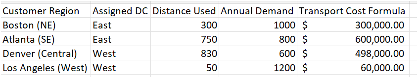 Customer Region | Annual Demand | Distance to East DC (NJ) | Distance to West DC (LA) |