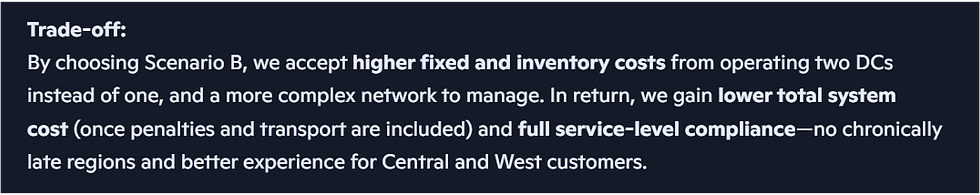 “Based on total cost and service level, which network design should we choose, and what trade-offs are we accepting with that decision?”